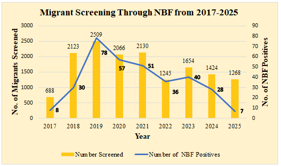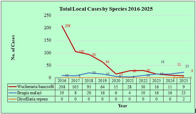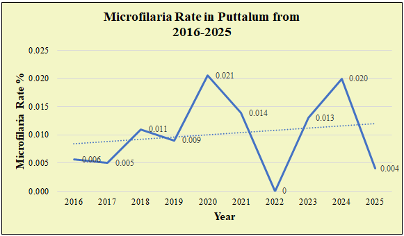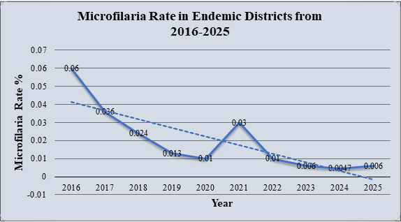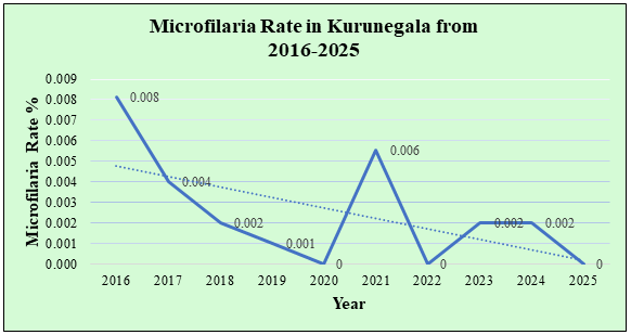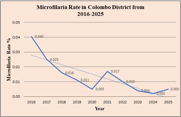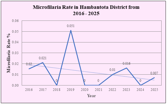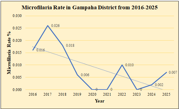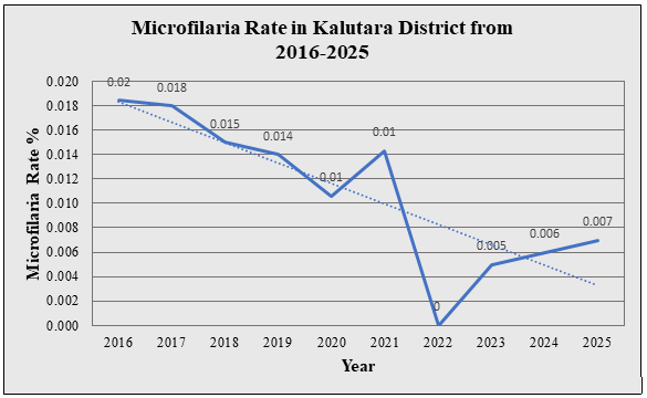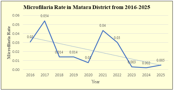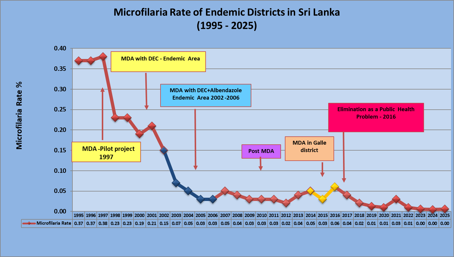 2010-2012 කාලය තුලදී, MDA ප්රතිකාරයෙන් පසුව ක්ෂුද්ර පණු අනුපාතය අඩු වූ අයුරු ප්රස්තාරයෙන් පෙන්නුම් කරයි. නමුත් 2013 සහ 2014 වසර වලදී, ක්ෂුද්ර පණු අනුපාතයේ තාවකාලික වැඩිවීමක් සිදු වූ අතර, එය මූලික වශයෙන් ගාල්ල දිස්ත්රික්කයේ කල NBF පරීක්ෂාවකින් පසු, වැඩි රෝගීන් සංඛ්යාවක් වාර්තා විම හේතුවෙනි. එයට ප්රතිචාරයක් වශයෙන් AFC මගින් ගාල්ල දිස්ත්රික්කයේ MDA ප්රතිකාරය ක්රියාත්මක කළේය.